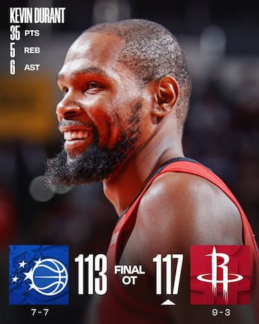 Quarto successo in fila per i Rockets, che hanno bisogno però di un tempo supplementare per avere ragione dei Magic sempre privi di Paolo Banchero e Jalen Suggs. Franz Wagner (29 punti) e Desmond Bane (26) firmano entrambi il loro massimo stagionale, ma non riescono a trovare le giocate giuste né per chiudere il quarto periodo (facendosi rimontare 11 lunghezze di vantaggio) né il supplementare, nel quale salgono in cattedra Kevin Durant (35 punti tra cui la tripla della parità nei regolamentari e il canestro del +2 a 9.2 secondi dalla fine dell’overtime) e Alperen Sengun (30 punti e 12 rimbalzi, tra cui il canestro sulla sirena per mandare la partita all'overtime)