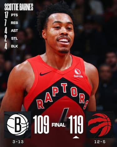 Nessun problema per i Raptors, che contro i Nets conquistano la settima vittoria consecutiva nonché l’11^ nelle ultime 12. Scottie Barnes segna 17 punti e Ja’Kobe Walter firma il suo season-high da 16 per avere ragione dei Nets, che mandano tre giocatori sopra quota 20 (Tyrese Martin con 26, Michael Porter Jr. 25 e Noah Clowney 22) ma si arrendono nel quarto periodo quando i padroni di casa piazzano un parziale di 10-0 per prendere definitivamente controllo del match, superando anche la distorsione al ginocchio subita da RJ Barrett nel terzo quarto