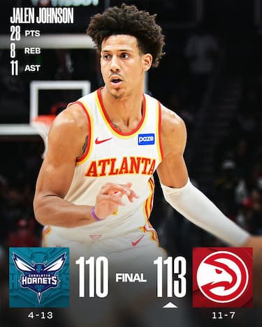 Settimo successo nelle ultime nove partite per gli Hawks, che contemporaneamente infliggono agli Hornets la sesta sconfitta in fila. Il rookie Kon Knueppel gioca un’altra grande partita (28 punti con 7 triple a segno, record di franchigia per una matricola) ma Nickeil-Alexander Walker gli ruba il pallone nel possesso del possibile sorpasso sul -2 a 11 secondi dalla fine, e dopo un 1/2 dalla lunetta la tripla di Miles Bridges sulla sirena non ha fortuna. Per i padroni di casa ci sono 28 punti, 8 rimbalzi e 11 assist di un sempre più convincente Jalen Johnson, insieme ad altri quattro compagni in doppia cifra (Alexander-Walker 23, Dyson Daniels 22 e Onyeka Okongwu 20)