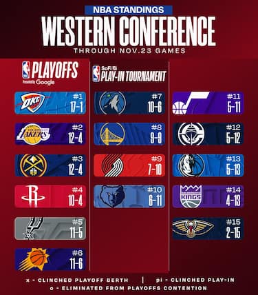 La marcia di OKC non conosce pause, mentre i Lakers approfittano dei ko di Denver, Houston e San Antonio per prendersi il secondo posto in classifica. Anche Phoenix sale sorprendentemente al sesto posto, mentre Utah lascia il decimo ai Memphis Grizzlies
