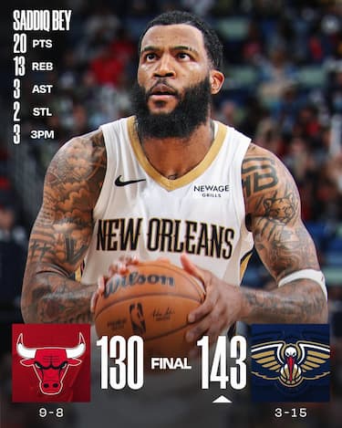 I Pelicans ritrovano il gusto della vittoria dopo nove sconfitte in fila, regalando la prima soddisfazione al coach ad interim James Borrego. Zion Williamson pareggia il suo massimo stagionale da 29 punti e Saddiq Bey ne aggiunge 20+14 con un paio di triple nel finale per proteggere il vantaggio dei padroni di casa, messi in difficoltà dai 28 di Ayo Dosunmu e i 24 di Coby White in una serata da 20/50 da tre per gli ospiti. Decisiva anche la panchina tutta in doppia cifra per i padroni di casa (Alvarado 16, Missi 14+14, McGowens 11 e Peavy 10)
