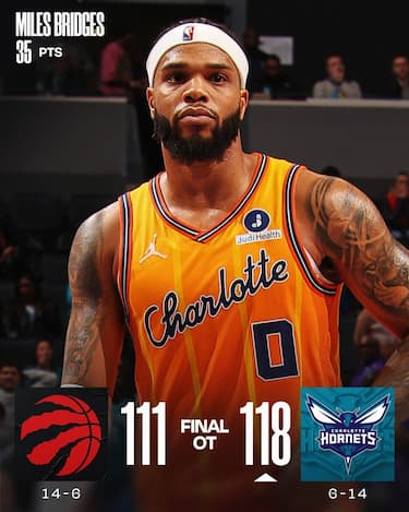 Si interrompe a nove la striscia di successi dei Raptors, che si fanno rimontare 17 punti di vantaggio nel primo tempo e cadono dopo un tempo supplementare sotto i colpi di Miles Bridges. L’ala degli Hornets segna 10 dei suoi 35 punti di serata nell’overtime, accompagnato dai 20 del rookie Kon Knueppel (tra cui la tripla fuori equilibrio per pareggiare a 10 secondi dalla fine dei regolamentari) per sopperire alle serate storte di Brandon Miller (7 punti con 1/13 al tiro) e LaMelo Ball (14 con 6/16 in meno di 22 minuti). Agli ospiti non bastano i 30 punti con 12 rimbalzi di Scottie Barnes e i 22 a testa di Brandon Ingram e Immanuel Quickley