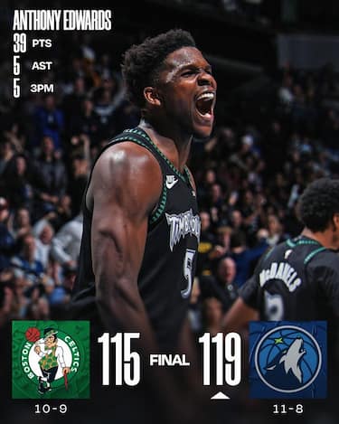 Per la prima volta in stagione i T’Wolves riescono a battere una squadra con un record sopra il 50% di vittorie: servono però 39 punti e un canestro decisamente improbabile di Anthony Edwards per avere ragione dei Celtics, rimasti sempre a contatto ma sconfitti definitivamente da una tripla sulla sirena per il +6 a 14 secondi dalla fine segnata dopo aver quasi perso il pallone. Minnesota interrompe così la sua striscia di tre sconfitte in fila, resistendo ai 41 punti di Jaylen Brown (nuovo massimo stagionale) e i 19 punti con 18 rimbalzi di Neemias Queta per i Celtics