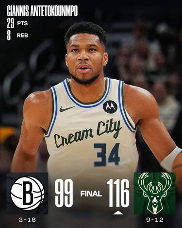 Dopo sette sconfitte in fila tornano a vincere anche i Bucks, che ringraziano i 29 punti in soli 19 minuti di un Giannis Antetokounmpo che festeggia con un successo il raggiungimento di quota 21.000 realizzati in carriera (sesto più giovane di sempre a riuscirci). I padroni di casa dilagano dalla metà del secondo quarto in poi toccando anche il +32 nella ripresa festeggiando anche il ritorno in campo di Kevin Porter Jr (13 punti), mentre i Nets privi di Michael Porter Jr si consolano con i 22 punti del rookie Danny Wolf (5/9 da tre)