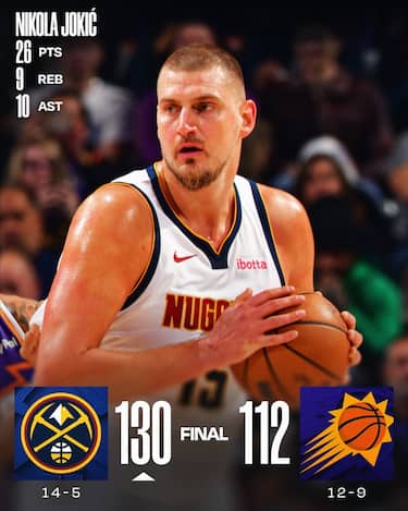 Dopo due sconfitte nelle ultime tre gare i Nuggets ritrovano il successo passando agilmente sul campo dei Suns. Un parziale di 12-0 nel quarto periodo permette a Nikola Jokic di ridurre al minimo le energie spese nel finale, mancando la tripla doppia per un solo rimbalzo (26 punti, 9 rimbalzi e 10 assist con 7/7 al tiro) accompagnato dai 24 di Jamal Murray in una serata torrida al tiro da tre punti (22/38). Ai Suns, sconfitti seppur di poco in tre delle ultime quattro gare, non servono i 27 di Dillon Brooks e i 24 di Devin Booker