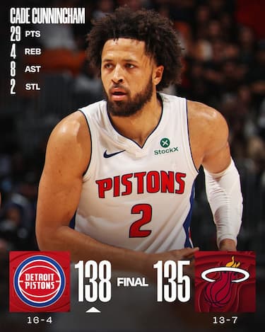 I Pistons tornano a vincere dopo due sconfitte in fila, resistendo al tentativo di rimonta degli Heat e conquistando il successo numero 16 di questo grande inizio di stagione. Sotto di 22 a 8 minuti dalla fine, i padroni di casa costruiscono canestro dopo canestro una rimonta che li porta fino al -2 a 34 secondi dalla fine, spinti dai 31 di Andrew Wiggins, i 28 di Norman Powell e i 24 di Tyler Herro. Detroit però non si scompone e trova il canestro per chiudere i conti col solito Cade Cunningham, autore di 29 punti per guidare i suoi insieme ai 26 di Tobias Harris. Ne mette 18 Duncan Robinson al suo primo ritorno a Miami da avversario, mentre Simone Fontecchio colleziona il primo DNP-CD della stagione, rimanendo in panchina per scelta tecnica per tutto il match