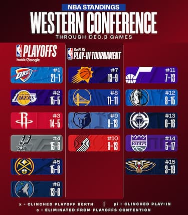Houston, San Antonio e Denver rimangono tutte a 5.5 gare di distanza dalla vetta, o per meglio dire a sola mezza distanza dal secondo posto dei Lakers visto che OKC sembra già irraggiungibile. Portland mantiene il decimo posto, anche se Dallas sembra essere tornata in corsa (1.5 gare di distanza dal play-in)