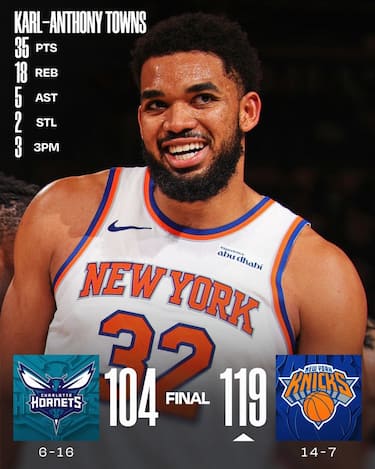 Undicesima vittoria su 12 in stagione in casa per i Knicks, che si affidano alle loro stelle per battere facilmente gli Hornets. Karl-Anthony Towns firma una doppia doppia da 35 punti e 18 rimbalzi mentre Jalen Brunson ne aggiunge 26 (tra cui la tripla sulla sirena del secondo quarto) per piegare in fretta la resistenza degli Hornets, che sono 1-10 in trasferta di cui le ultime nove sconfitte consecutive. Un redivivo LaMelo Ball da 34 punti, 8 rimbalzi e 9 assist non serve agli ospiti, scivolati sul -20 già a metà del secondo quarto