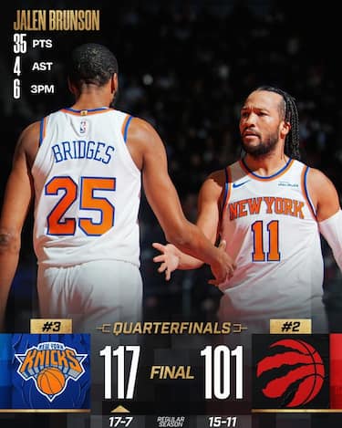 Nel secondo quarto di finale sono i New York Knicks ad approfittare delle difficoltà di questo periodo dei Raptors, vincendo in trasferta e sfatando il tabù dei quarti di NBA Cup, che avevano raggiunto negli ultimi due anni ma senza mai superarli. A guidare i bluarancio è immancabilmente Jalen Brunson: 35 punti per lui di cui 26 nel primo tempo (suo record stagionale), accompagnato dai 21 di Josh Hart e i 14 con 16 rimbalzi del rientrante Karl-Anthony Towns. I Raptors finora avevano sempre vinto in NBA Cup, collezionando quattro vittorie all’interno del periodo in cui hanno vinto 13 partite su 14. Delle ultime sette gare però ne hanno vinta solo una, e neanche i 31 punti di Brandon Ingram e il career-high da 18 di Jamal Shead sono riusciti a evitare il quarto ko consecutivo in casa