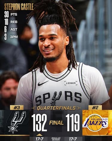 I giovani Spurs sono ben più del solo Wembanyama e lo dimostrano andando a vincere con autorità sul campo dei Lakers, staccando il biglietto per la semifinale contro i Thunder a Las Vegas e agganciando anche i gialloviola in classifica. Dopo un primo quarto equilibrato i nero-argento prendono il controllo del match nel secondo quarto, toccando il massimo vantaggio sul +24 nella ripresa e gestendo il rientro dei gialloviola concedendo al massimo di tornare a -8. Steph Castle è il migliore dei suoi con 21 dei suoi 30 punti nel secondo tempo insieme a 10 rimbalzi e 6 assist, De’Aaron Fox ne aggiunge 20 e Keldon Johnson 17 dalla panchina, mentre ai Lakers (sconfitti per la terza volta nelle ultime 12 gare) non bastano i 35 punti di Luka Doncic e i 19 con 15 rimbalzi di LeBron James, oltre ai 26 di un Marcus Smart da 8 triple. Delle 12 gare saltate da Wembanyama, gli Spurs ne hanno vinte nove — meritandosi il viaggio a Las Vegas per sfidare OKC