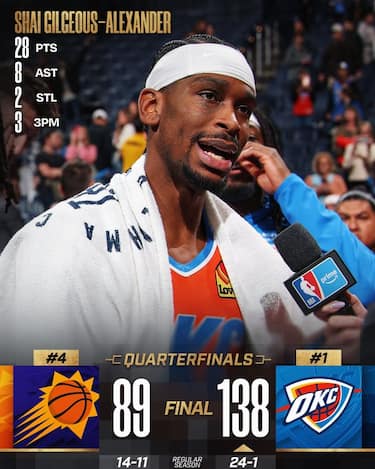 Nella striscia di vittorie dei Thunder, la più lunga nella storia della franchigia, solo una squadra era riuscita a perdere con uno scarto sotto la doppia cifra: i Suns. Questa volta però non c’è assolutamente storia tra la miglior squadra della NBA e quella priva di Devin Booker: i padroni di casa infatti partono fortissimo e toccano il +20 già nel primo quarto, sfondano il muro del +40 nel terzo e toccano il massimo vantaggio sul +53 nel quarto, staccando il biglietto per la semifinale di Las Vegas. Shai Gilgeous-Alexander è il migliore dei suoi con 28 punti in meno di 27 minuti, seguito dai 24 di Chet Holmgren e tutti gli altri 13 compagni scesi in campo che hanno segnato almeno un canestro, pareggiando il record di 24-1 dei Golden State Warriors del 2015-16 come migliore di tutti i tempi per cominciare la stagione. Per gli ospiti, tenuti sotto il 40% al tiro, ci sono a malapena i 16 di Dillon Brooks con 4/16 dal campo ma non evitano la peggior sconfitta nella storia della franchigia per scarto finale