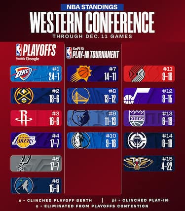 Denver consolida il suo secondo posto alle spalle di OKC, così come Houston segue a ruota e si prende la terza posizione. Portland viene raggiunta da Dallas e perde il decimo posto, Sacramento e Clippers continuano a sprofondare mentre New Orleans vince la quarta partita della stagione