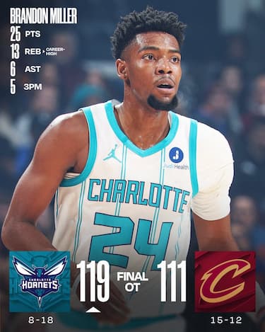 Continua il momento negativo dei Cavs, che sbagliano tutti i 10 tiri tentati nel supplementare e perdono in casa contro gli Hornets nonostante i 26 di Darius Garland e i 17 di Donovan Mitchell, perdendo per la sesta volta nelle ultime 9. La rimonta da -17 per pareggiare nel quarto periodo si ferma però sull’errore di Mitchell per vincere il match all’ultimo secondo, mentre nel supplementare sono i 29 punti di Kon Knueppel e i 25 di Brandon Miller a fare la differenza per gli Hornets, che fuori casa hanno un record di 3-10 ed erano privi di LaMelo Ball, Collin Sexton e Tre Mann