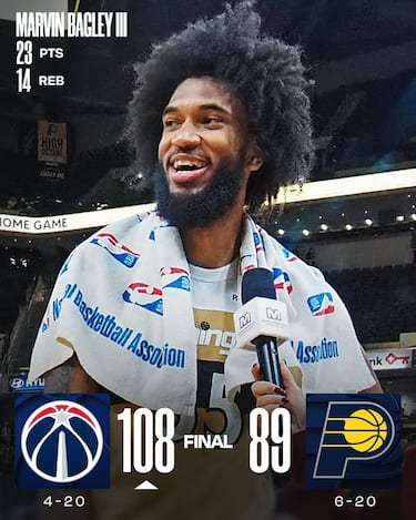 Gli Wizards tornano a vincere in trasferta dopo quasi due mesi e lo fanno grazie alla difesa, tenendo i Pacers sotto il 37% dal campo e il 26% da tre punti per infliggere loro la quarta sconfitta nelle ultime sei. Il migliore per gli Wizards è un Marvin Bagley da 23 punti e 13 rimbalzi, seguito dai 18 di CJ McCollum per rimandare ancora una volta la festa per la 1.000^ vittoria in carriera di Rick Carlisle, che non ha molto di più rispetto ai 15 punti di Bennedict Mathurin