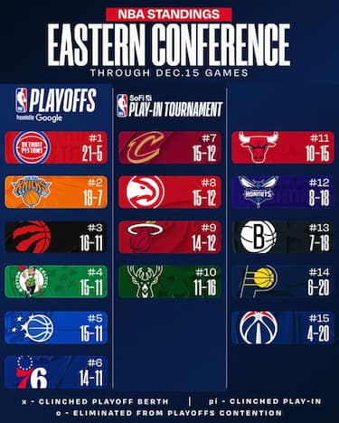I Detroit Pistons restano saldamente al comando dell’Est grazie alla quarta vittoria in fila. Alle spalle dei New York Knicks, secondi, ci sono i Toronto Raptors che con la vittoria di Miami superano i Boston Celtics, al secondo stop in fila e ora appaiati agli Orlando Magic.Gli Heat scivolano invece al nono posto dopo la quinta sconfitta consecutiva.