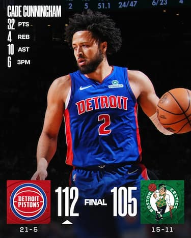 I Detroit Pistons vincono al TD Garden e si prendono la rivincita sui Boston Celtics dopo la sconfitta di tre settimane fa che aveva chiuso la loro striscia di 13 successi consecutivi. La capolista dell’Est (21-5) centra il quarto successo consecutivo e infligge ai biancoverdi il secondo stop, dopo la serie positiva: brilla Cade Cunningham, 32 punti, 10 rimbalzi e i liberi che stoppano la rimonta dei Celtics, arrivati fino al -2 (104-102) dopo un canestro di White, 31 punti. Boston ha anche 34 punti con 8 rimbalzi e 7 assist da Jaylen Brown ma paga il 10 su 39 da tre, con 20 errori tra la fine del primo e l’inizio del quarto quarto.