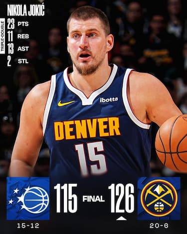 Il sesto successo consecutivo dei Nuggets arriva grazie a un secondo quarto da 43-22 per i padroni di casa, guidati da 20 dei 32 punti di serata di Jamal Murray solamente in quella frazione di gioco per rimontare da -14. A tutto il resto ci pensa la 13^ tripla doppia stagionale di Nikola Jokic da 23 punti, 11 rimbalzi e 13 assist, superando anche Kareem Abdul-Jabbar per maggior numero di assist in carriera (ora è a 5.667) da parte di un centro. Agli ospiti, privi di Franz Wagner e Jalen Suggs, non basta la tripla doppia da 26-16-10 di Paolo Banchero, alla sua terza in carriera