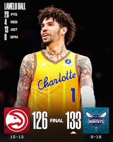 Il ritorno in campo di Trae Young (8 punti e 10 assist) viene rovinato dalla serata torrida da tre punti degli Hornets. I padroni di casa ne segnano 18 solamente nel primo tempo (record NBA pareggiato) e chiudono con 24/49, guidati da un eccellente LaMelo Ball (7/9 nel primo tempo per 28 punti e 13 assist alla fine), dall’ormai solito Kon Knueppel (28 punti) e dai 26 di Brandon Miller. Agli Hawks, arrivati alla quinta sconfitta nelle ultime sette, non basta la tripla doppia sfiorata da Jalen Johnson (43 punti, 11 rimbalzi e 9 assist) e i 28 di Nickeil Alexander-Walker