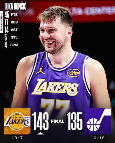 Una tripla doppia da 45 punti, 11 rimbalzi e 14 assist di Luka Doncic guida i Lakers al successo sul campo degli Utah Jazz. Sconfitte a sorpresa per Houston, che si fa rimontare 25 punti di vantaggio a New Orleans e perde al supplementare, e per Detroit, che tira 6/33 da tre e cade a sua volta dopo un overtime a Dallas. Nikola Jokic firma la sua 13^ tripla doppia stagionale e con 14 assist diventa il miglior centro passatore di sempre, Shai Gilgeous-Alexander ne mette 32 in meno di 30 minuti e OKC travolge i Clippers. Il canestro del sorpasso di Jalen Brunson a 4.4 secondi dalla fine regala la 7^ vittoria in fila ai Knicks. Di seguito i risultati e gli highlights delle 12 partite della notte