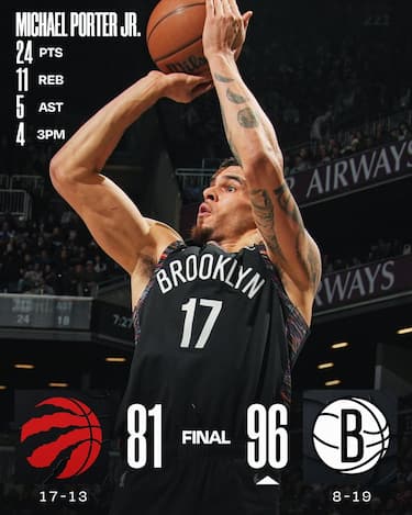 Brooklyn tocca il +15 nel terzo quarto, viene rimontata e sorpassata a inizio del quarto periodo, ma con un parziale finale di 29-16 riesce a spuntarla concedendo il minimo stagionale ai propri avversari. Il migliore realizzatore è Michael Porter Jr con 24 punti insieme ai 19 di Noah Clowney, mentre i 19 di Brandon Ingram non riescono a evitare la sesta sconfitta nelle ultime nove dei canadesi — che avevano cominciato la stagione con un record di 15-7