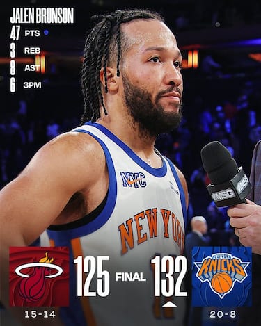 In una serata opaca di Karl-Anthony Towns (2 punti e 6 rimbalzi in 29 minuti), sono tutti gli altri Knicks a sopperirne il mancato apporto, a cominciare ovviamente da Jalen Brunson. L’MVP dell’ultima NBA Cup chiude una settimana d’oro realizzando il suo massimo stagionale da 47 punti grazie a uno splendido 15/26 dal campo di cui 6/13 dalla lunga distanza e un perfetto 11/11 ai liberi. I 24 punti di Mikal Bridges gli danno man forte per infliggere a Miami la settima sconfitta nelle ultime otto gare, nonostante un Kel’el Ware sontuoso da 28 punti e 19 rimbalzi. Si ferma a 7 Simone Fontecchio, che in 17 minuti di gioco accumula anche 4 rimbalzi e 3 assist ma segna solo una tripla a fronte di altri cinque errori al tiro e sbaglia tre tiri liberi sui sette tentati