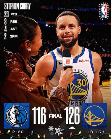 Golden State fa gara di testa dal 1° quarto contro Dallas, approfittando dell’uscita dal campo per infortunio di Anthony Davis nel 2° quarto per conquistare il successo natalizio. Cooper Flagg segna 27 punti al suo debutto a Natale ma gli Warriors rispondono con i 23 di Steph Curry, autore anche della tripla che a 3:45 dalla fine chiude i conti, e con altri 6 giocatori in doppia cifra
