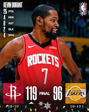 È un vero e proprio dominio quello operato dai Rockets, che spazzano via i Lakers a rimbalzo (48-25 il conteggio complessivo alla fine) e grazie alle prestazioni di Kevin Durant (25 punti e 8 assist) e Amen Thompson (24 punti e 7 rimbalzi) passano senza alcun problema a Los Angeles festeggiando così un Natale vincente. Ai padroni di casa, mai davvero in partita, servono a poco i 25 punti di Luka Doncic