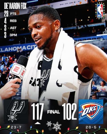 La 3°vittoria in altrettante partite per gli Spurs contro i Thunder, arriva infliggendo ai campioni NBA in carica la 1° sconfitta stagionale davanti al proprio pubblico. Tutti i giocatori in campo per San Antonio si esprimono al meglio delle loro possibilità, guidati dai 29 di De’Aaron Fox. Ai Thunder non bastano i 22 di Shai Gilgeous-Alexander in una serata opaca al tiro (11/44 da tre di squadra), subendo la 4° sconfitta nelle ultime 6 gare giocate