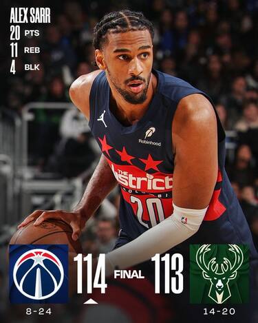 I Bucks ancora una volta in questa stagione non riescono a vincere tre partite in fila, cadendo contro Washington per la seconda volta in questo mese. Questa volta a decidere la partita è un canestro di CJ McCollum a un secondo dalla fine, suggellando una prestazione da 18 punti per accompagnare i 20 a testa di Alex Sarr e Bub Carrington per gli ospiti. Ai Bucks non sono bastati i 33 punti con 15 rimbalzi di Giannis Antetokounmpo, che non è riuscito a segnare il canestro del controsorpasso sull’ultimo possesso