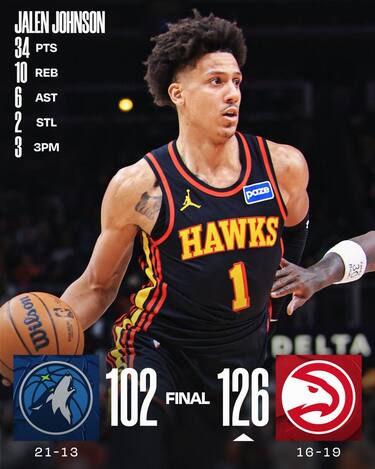 Gli Hawks tornano a vincere dopo sette sconfitte consecutive e lo fanno in maniera convincente, battendo nettamente i T’Wolves grazie a un secondo quarto da 37-23 per andare all’intervallo sul +21. Jalen Johnson è il migliore dei suoi con 34 punti e 10 rimbalzi, ma è il ritorno di Kristaps Porzingis (16 punti in 17 minuti) a cambiare tutto per i padroni di casa. Anthony Edwards ne mette 30 nel suo ritorno a casa, ma viene richiamato in panchina a 7 minuti dalla fine a gara ormai conclusa e, dopo aver lanciato un asciugamano per la frustrazione, torna negli spogliatoi con la partita ancora da concludere