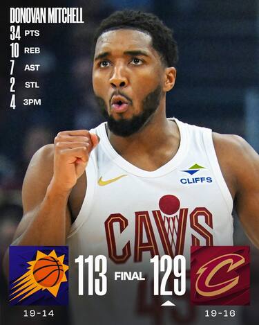 Un primo quarto da 37-21 e un ultimo da 33-24 permette ai Cavs di interrompere la striscia di quattro vittorie consecutive dei Suns. Per riuscirci Donovan Mitchell deve mettere assieme una prestazione da 34 punti, 10 rimbalzi e 7 assist, seguito dai 19 di Darius Garland e dalle doppie doppie di Evan Mobley (16+10) e Jarrett Allen (16+11). Devin Booker è il migliore dei suoi con 32 punti di cui 20 nel solo terzo quarto, ma Dillon Brooks segna 0 punti nella ripresa dopo i 20 realizzati nel primo tempo e i Suns finiscono sotto anche di 24 nel quarto periodo