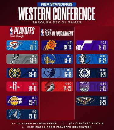 OKC mantiene 4.5 gare di vantaggio su San Antonio e 5.5 su Denver, mentre Phoenix non approfitta del ko di Minnesota per riavvicinarsi al sesto posto. In zona play-in perdono tutte tranne i Clippers, che cavalcano una striscia di cinque vittorie in fila. Sono cinque ko consecutivi invece per i Pelicans, sempre ultimi