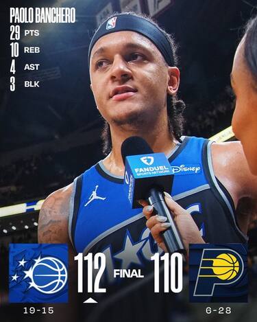 È un canestro di Paolo Banchero a 7.5 secondi dalla fine a decidere la sfida tra Magic e Pacers, condannando Indiana alla 10^ sconfitta consecutiva. Gli ospiti rimontano da -10 nel terzo quarto guidati proprio da Banchero, autore di 29 punti con 10 rimbalzi insieme ai 18 di Desmond Bane, mentre ai padroni di casa non servono i 26 di Pascal Siakam e i 23 di Bennedict Mathurin, cedendo definitivamente dopo l’errore da tre di Aaron Nesmith che avrebbe potuto dare loro il vantaggio a 3.1 secondi dalla fine