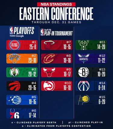 Detroit allunga nei confronti di New York, rimettendo due gare di distanza in vetta alla Eastern Conference. Orlando si riavvicina a Toronto, mentre sia Chicago che Atlanta allungano su Milwaukee nella corsa agli ultimi posti per il play-in. Continua la discesa di Indiana, arrivata alla decima sconfitta consecutiva
