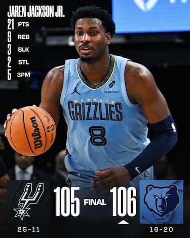 Il ritorno di Victor Wembanyama dopo due gare di assenza non basta agli Spurs, che hanno 30 punti da loro numero 1 ma devono fare a meno di lui nel finale di gara, complice la restrizione al minutaggio per il francese (solo 21 minuti in campo). A quel punto è Cam Spencer a prendere in mano la partita per i Grizzlies, realizzando 5 punti negli ultimi 86 secondi di partita per chiudere a quota 21 (gli stessi di Jaren Jackson Jr) insieme alla difesa di Santi Aldama, capace di stoppare De’Aaron Fox a 5 secondi dalla fine per tornare alla vittoria dopo quattro sconfitte in fila