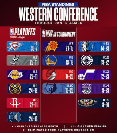 San Antonio perde l’occasione di avvicinarsi a OKC ma rimane seconda a Ovest, pur con lo stesso numero di sconfitte dei Lakers (terzi con due vittorie in meno) e Rockets (quinti con tre vittorie in meno). Minnesota è sempre lì in sesta posizione, mentre Memphis risponde alla vittoria di Dallas per tenersi la decima piazza
