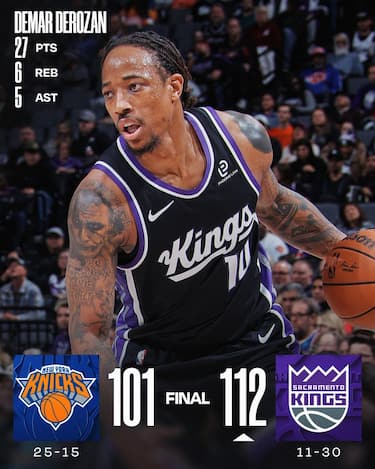 Contro i Knicks, Sacramento parte fortissimo, si crea un vantaggio in doppia cifra e lo porta fino alla fine ottenendo la 3^vittoria consecutiva. DeMar DeRozan (27 punti) e Zach LaVine (25) guidano i compagni, mentre New York, una volta perso per infortunio Jalen Brunson già nel 1°quarto, non trova più la via del canestro con continuità e affonda senza più riuscire a tornare in partita