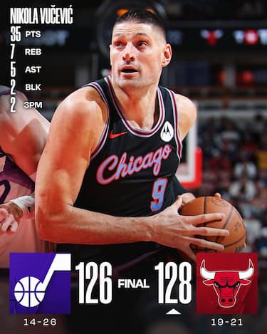 È un canestro nel finale di Nikola Vucevic, autore di una prova da 35 punti e 7 rimbalzi, a decidere una gara combattutissima che cambia padrone per ben 26 volte e a regalare ai Bulls una vittoria molto sudata. Senza Lauri Markkanen, i Jazz hanno 25 punti e 7 assist da Keyonte George ma soprattutto restano in corsa fino alla fine grazie alla serata di grazia di Brice Sensabaugh, che segna il suo career high con 43 punti e 15/22 al tiro