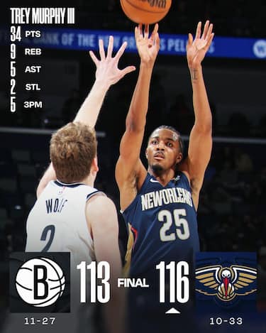 Vittoria in volata per i Pelicans sui Nets, con i padroni di casa che nel finale trovano le giocate decisive di un grande Trey Murphy (34 punti, 9 rimbalzi e 5 assist) e Saddiq Bey (12 punti), riuscendo a far meglio di una Brooklyn che manda 6 giocatori in doppia cifra con il solito Michael Porter Jr. (20 punti) a guidare il gruppo, ma si blocca sul più bello