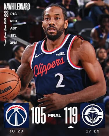 Kawhi Leonard non si prende una serata di pausa nemmeno contro Washington, anche perché i suoi 33 punti con 7/11 al tiro dalla lunga distanza servono tutti per ottenere la vittoria. Gli Wizards, infatti, prima vanno sotto nettamente, poi nel 3° quarto approfittano del calo d’attenzione da parte dei Clippers e si rifanno sotto grazie soprattutto a un Kyshawn George da 23 punti, senza però riuscire a completare il loro tentativo di rimonta