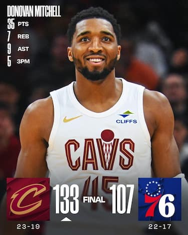 Prova di forza dei Cavs, che a Philadelphia mettono le mani sulla partita già dal 1°quarto e conducono fino alla fine ottenendo una vittoria importante anche per gli equilibri di classifica della Eastern Conference. A guidare Cleveland è ancora una volta un Donovan Mitchell da 35 punti, 9 assist e 7 rimbalzi, mentre i Sixers hanno 20 punti in 25 minuti giocati da Joel Embiid ma non riescono mai a trovare il ritmo giusto in attacco