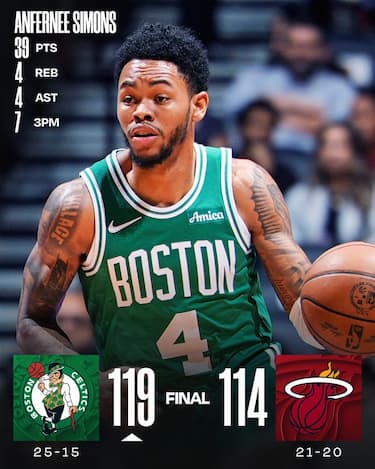 È Anfernee Simons, che segna 18 dei suoi 39 punti nel decisivo 4° quarto, il protagonista della vittoria dei Celtics, che a Miami accelerano proprio nell’ultima frazione di gioco e hanno la meglio. Gli Heat mandano 3 giocatori oltre i 20 punti, con Norman Powell a quota 26, ma l’attacco dei padroni di casa si ferma nel finale. Serata complicata anche per Simone Fontecchio, che gioca poco meno di 17 minuti in cui segna 3 punti, tutti dalla lunetta, e prova a contribuire con 4 rimbalzi