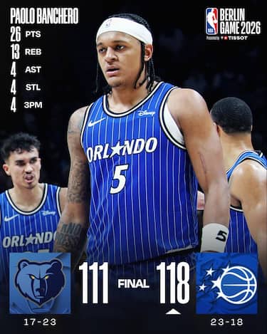 Nella cornice della Uber Arena di Berlino, completamente sold out, sono i Magic dei beniamini di casa Franz (18 punti e 9 rimbalzi) e Moritz Wagner (7 punti e 4 rimbalzi) ad avere la meglio al termine di una gara molto combattuta dove i protagonisti principali sono da una parte Paolo Banchero (26 punti e 13 rimbalzi) e Jaren Jackson Jr. (30 punti)