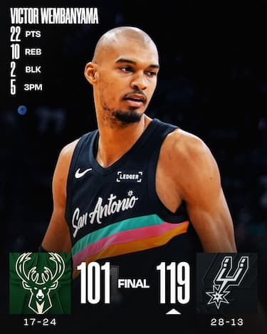 Tutto facile per gli Spurs contro Milwaukee, perché l’unico spavento arriva nel 1° quarto per un possibile infortunio a Victor Wembanyama, che però rientra prontamente in campo e guida i suoi con 22 punti e 10 rimbalzi insieme a uno Stephon Castle da 19 punti e 10 assist. Prova incolore per i Bucks, compreso uno Giannis Antetokounmpovisibilmente frustrato e che chiude con 21 punti in 22 minuti giocati
