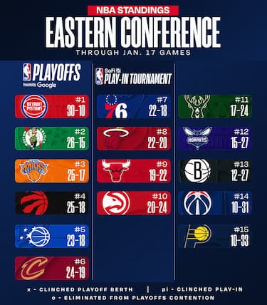 Detroit e Boston staccano ulteriormente New York, che ora ha solo mezza gara di vantaggio su Toronto e 1.5 su Orlando e Cleveland. Miami si riavvicina a Philadelphia, mentre nella parte bassa rimane tutto invariato