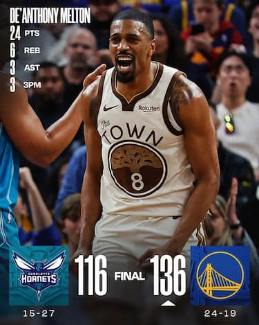 Otto giocatori in doppia cifra, 23 triple a segno di squadra e anche senza Jimmy Butler i Golden State Warriors non hanno problemi contro Charlotte, guidati da 24 punti di De’Anthony Melton e dai 20 di Draymond Green. Agli ospiti non servono i 28 di Brandon Miller e i 24 di Kon Knueppel, con LaMelo Ball autore di 15 punti ma con 5/17 al tiro uscendo dalla panchina. Per la terza partita consecutiva gli Warriors hanno 10 giocatori con almeno una tripla a segno: non era mai successo nella storia NBA