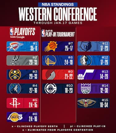 San Antonio e Denver guadagnano una partita sia davanti su OKC che soprattutto alle spalle su Minnesota. I Lakers continuano a scendere e sono ora raggiunti dai Suns che hanno una vittoria e una sconfitta in più, ma anche Golden State è distante solo 1.5 partite. Portland e Clippers chiudono la zona play-in