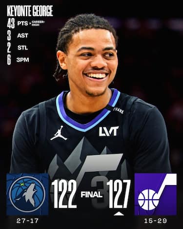I Jazz fanno un bel regalo a coach Will Hardy per la sua 100^ vittoria in carriera, rimontando da -15 per battere Minnesota. Il protagonista assoluto è Keyonte George autore del suo massimo in carriera da 43 punti, ma non è da meno neanche Jusuf Nurkic che firma una tripla doppia da 16 punti, 18 rimbalzi e 10 assist che non realizzava da sette anni. Agli ospiti non bastano i 38 di Anthony Edwards e i 19 di Julius Randle, subendo la terza sconfitta consecutiva nonostante gli avversari fossero privi di Lauri Markkanen (senza il quale non avevano mai vinto quest’anno)