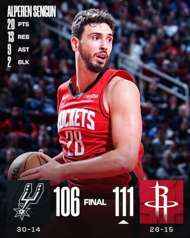 I Rockets rimontano anche 16 punti di svantaggio e con un ultimo quarto da 29-14 vincono il derby texano contro gli Spurs, ringraziando i 21 punti di Reed Sheppard (12 nel solo quarto periodo), i 18 di Kevin Durant e la tripla doppia sfiorata da Alperen Sengun (20 punti, 13 rimbalzi e 9 assist). Il migliore in casa Spurs è Julian Champagnie con 27 punti frutto di 8 triple a segno, mentre Victor Wembanayama viene tenuto a 14 punti e 10 rimbalzi dalla difesa dei Rockets