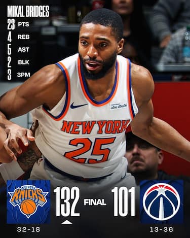 Nessun problema per i Knicks a Washington, perché Mikal Bridges, migliore dei suoi con 23 punti, e compagni mettono subito le mani sulla partita già nel 1° quarto e controllano fino alla sirena finale. Altra prova positiva per il rookie degli Wizards Will Riley, autore di 17 punti e 6 rimbalzi in uscita dalla panchina